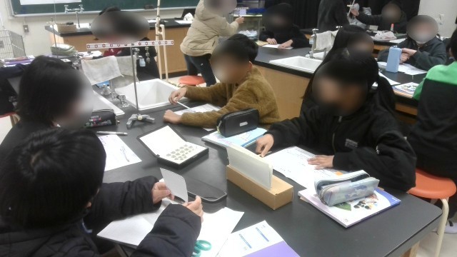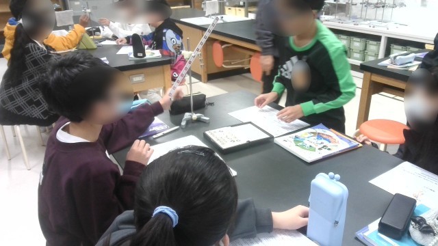 理科で「てこ」について学習していました。実験用てこを使って、支点から力点までの距離と重さの関係について調べていました。実験用てこの片一方の腕の支点から力点までの距離6のところに10グラムの重りをつるし、もう片一方の腕の支点から力点までの距離1~6に何グラムの重りをつるすと腕が平行になるかを実験していました。