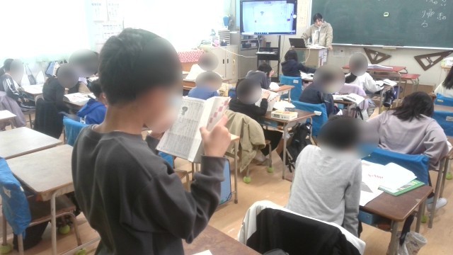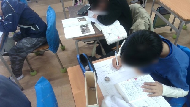 国語の学習です。語句の意味調べをするのに、国語辞典の使い方を復習していました。最初の語句だけ先生がモニターで説明しながら調べて、残りは自分たちで調べていました。