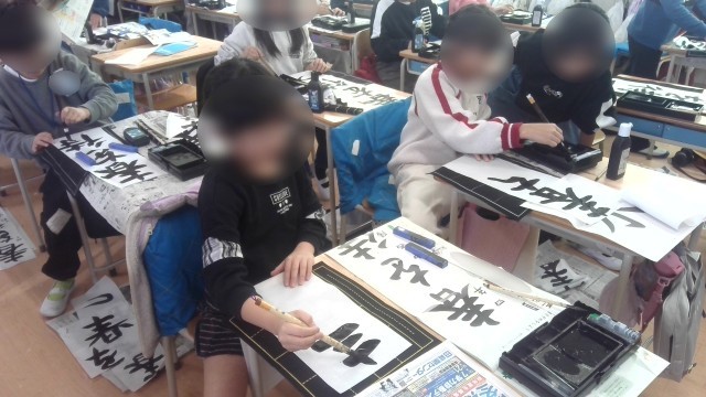 書写の学習で、書初めに取り組んでいました。お題は「春を待つ」です。教室の机は書初め用半紙で書を書くには少し狭いですが、子どもたちはそれぞれ工夫して書いていました。「うまく書けた!」と満足そうにしている子が多くいました。
