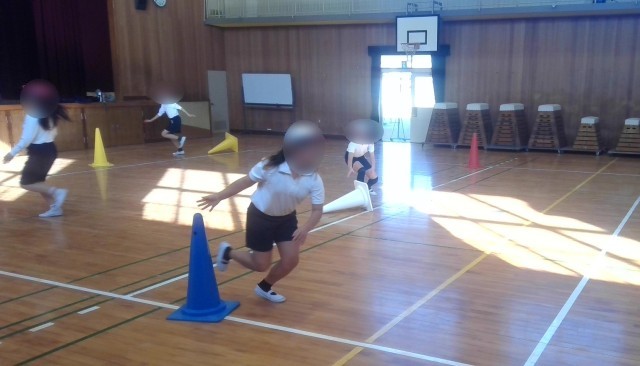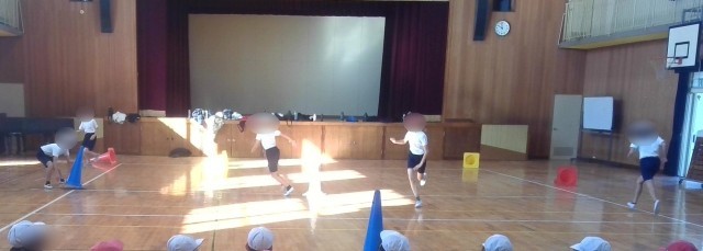 赤白の2チームに分かれてゲームをしていました。9つのコーンを制限時間内に紅組は倒す、白組は立てるを繰り返して、最終的に倒れているコーンの数を競うゲームでした。どの子も制限時間内にコートいっぱいに動いて倒したり立てたりを繰り返していました。運動量がとても多く楽しいゲームでした。