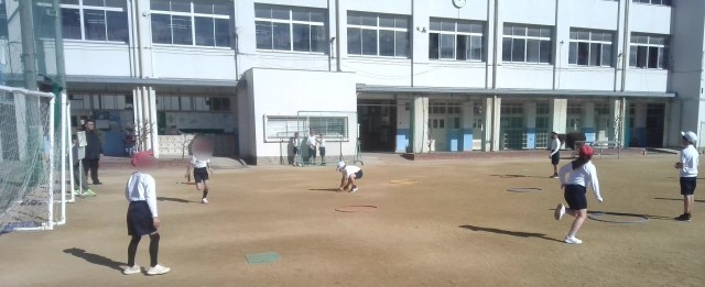 体育の学習でティボール型のゲームを楽しんでいました。攻撃するほうも守備するほうもバッティングやキャッチングなどの技術がずいぶん向上してきたのでゲームがより楽しく盛り上がるようになってきました。