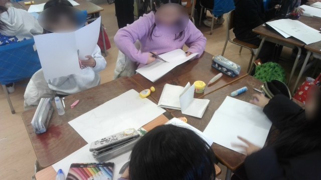 図工の学習です。紙版画に取り組んでいました。「海の生き物」という題材で考えていました。どんな生き物が躍動した版画になるか楽しみです。