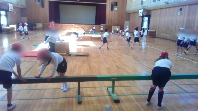 下段は3組、体育で跳び箱遊び運動をしていました。いろいろな場を設定して自分の課題に合わせて練習していました。