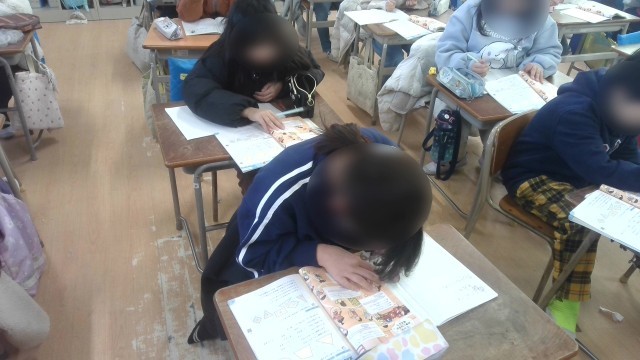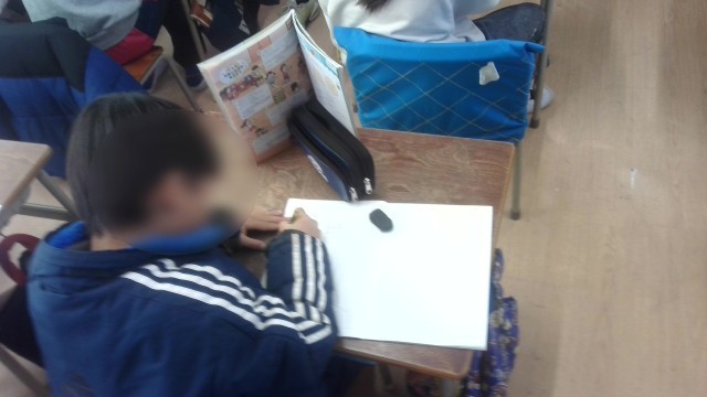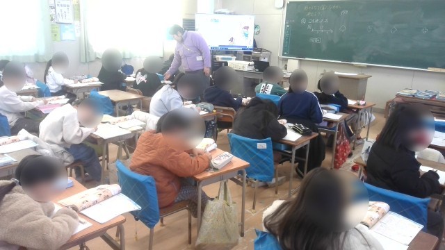 算数です。問題を解くのに□を使った式を立てて考える学習のまとめをしていました。□を使った式で立式するときは何算で、実際に□を求めるには何算になるのかを考えていました。