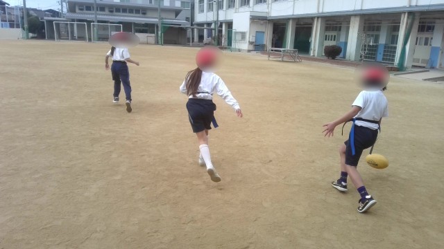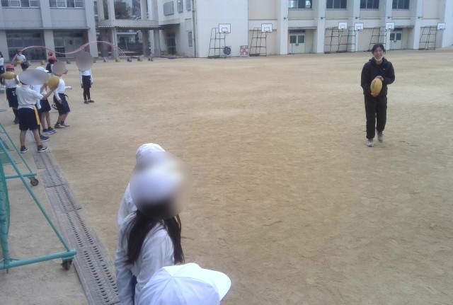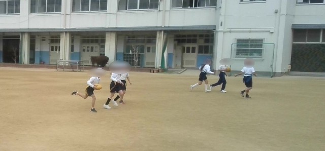 体育で、タグラグビーの学習に入りました。まずは、ラグビーボールでのキャッチボールやパスの練習からです。球形でないボールを後ろにパスしながら前進していくという、今までとは全然違う動きに戸惑っていました。