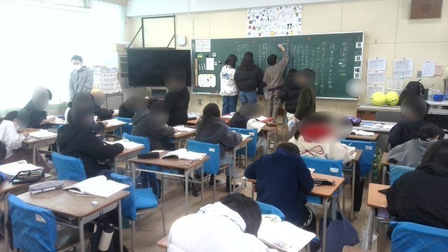 道徳の学習です。課題文を読んで、自分の考えを黒板に発表し、意見交流しました。その発表を聞いて、近くの友だち同士でも発表内容を含めて意見交換して深めていました。