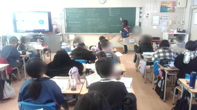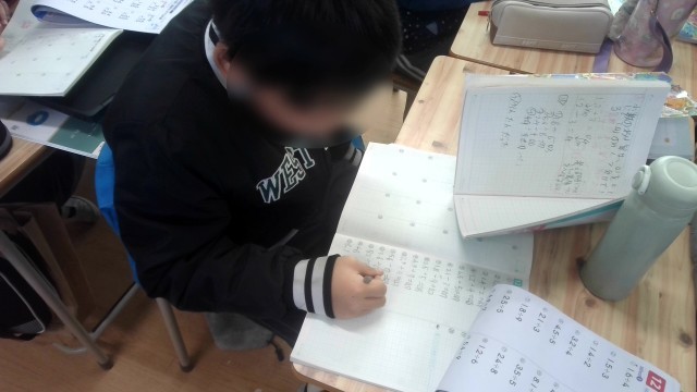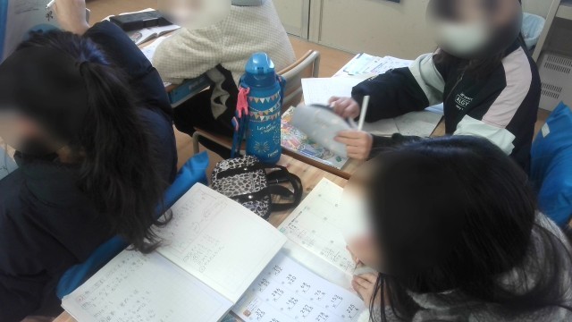 算数の学習で、小数÷整数の計算の仕方を学習していました。「1.2mのテープを3等分した時の1本分の長さを求めよ」という課題を考えた時、二通りの考え方(1.2を0.1が12個分として考える、1.2mを120cmとして考える)をすれば整数÷整数の計算が使えるのではという意見が出ていました。それぞれの考え方で答えを導き出す中で、0.1をもとにしていく考え方のほうが応用範囲が広くていいという結論になったようです。そのあと、ドリル等を使って練習問題に取り組んでいました。