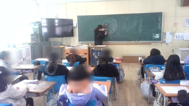 下段は3組、算数で図形について学習していました。コンパスを使って二等辺三角形や正三角形などを描いていました。