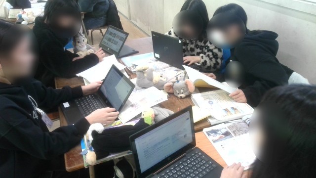 社会科で学習した災害・防災について、文献や資料、ネットなどで調べていました。各班でテーマを決め(地震についてや日本の災害・被災マップなど)新聞などにして発表します。それぞれの班で活発な話し合いが行われていました。