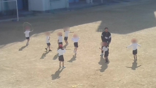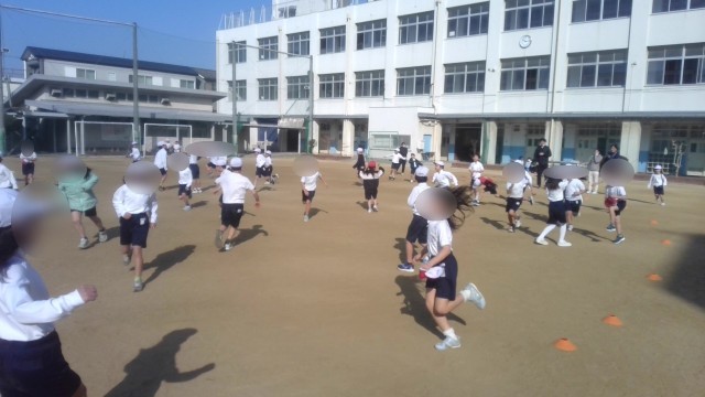 合同体育の様子です。まずは、持久走、3分間同じペースでで何週走れるかを頑張っていました。そのあと、鬼ごっこで運動場中を走り回っていました。最後になわとびをして技の練習に励んでいました。目一杯体を動かした1時間でした。