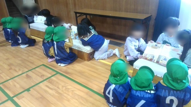 中段は、「よみきかせ」コーナー、1年生が園児たちに絵本を読み聞かせます。