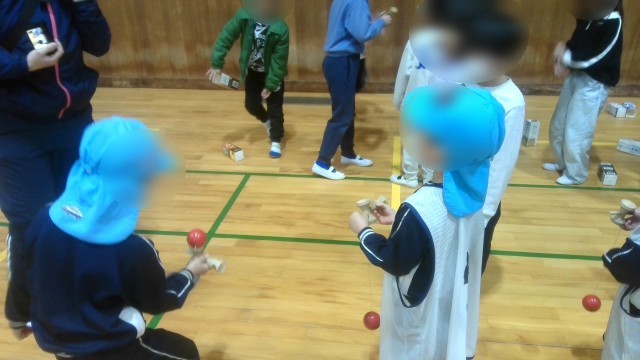 下段は、「けんだま」コーナー、1年生が見本を見せて、そのあと、園児たちが挑戦していました。