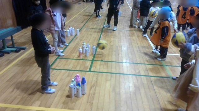 中段は、「ボーリング」コーナー、ペットボトルで作ったピンをソフトドッジボールを投げて倒すゲームです。