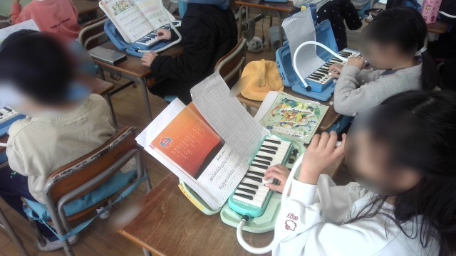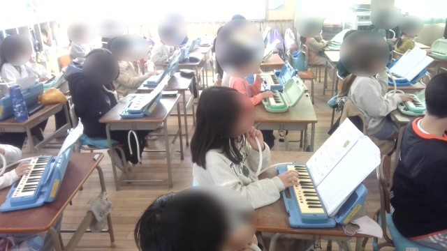 音楽の学習で、鍵盤ハーモニカの練習をしていました。「カエルの歌」の輪奏に取り組んでいました。