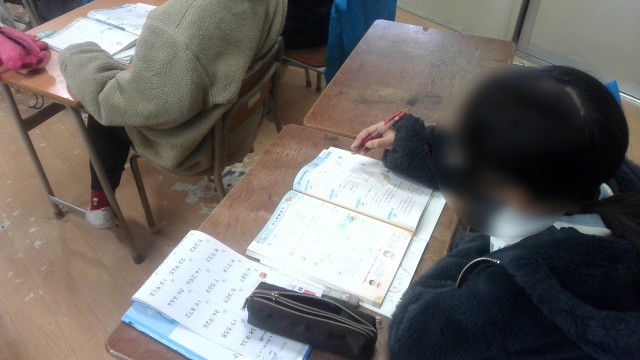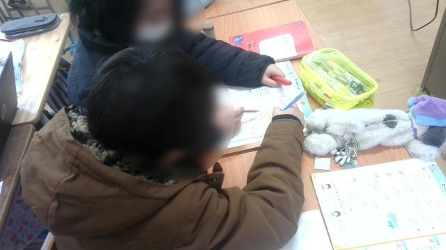 算数の学習です。図形の学習で、長方形の中に引いた線で直角に交わる線を探す課題でした。隣の友だちと相談もして見つけ出していました。