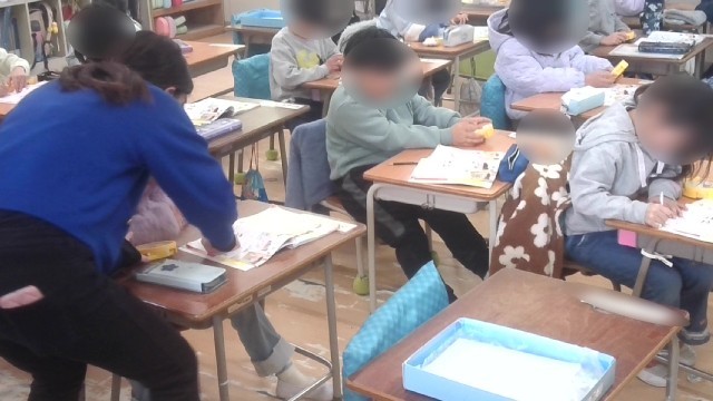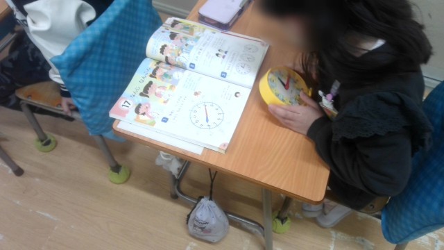 算数で時計の見方について学習していました。〇〇時から△分たったら長い針はどこまで動くかや、〇〇時から□分たったら何時何分かなどの問題に取り組んでいました。学習用時計を動かしながら考えていました。