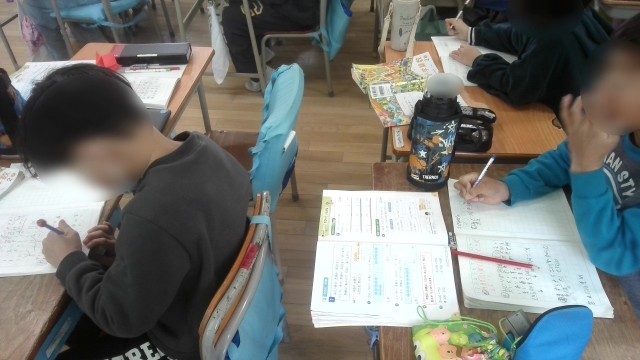 算数で、100の位の計算の学習をしていました。教科書の文章題に取り組み、文の中の必要な数字や大事な言葉をみんなで見つけ出して式を考えていました。