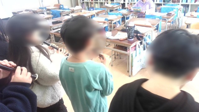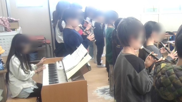 音楽の学習です。リコーダー合奏の練習をしていました。「エーデルワイス」をオルガン奏者や伴奏の様子などを変えて何度も練習していました。