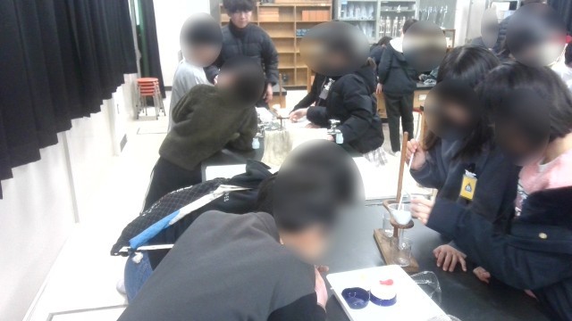 理科の学習です。水溶液を熱していき、溶けているものを取り出して調べる実験をしていました。漏斗の使い方や水溶液の入れ方、加熱するときの注意事項などを確認してから実験に取り掛かっていました。