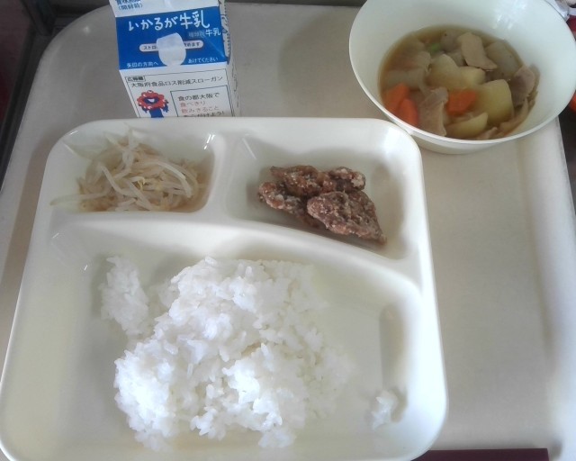 今日の献立は、クジラの竜田揚げ、豚肉とジャガイモの煮もの、もやしの甘酢和え、ご飯、牛乳です。いただきます。