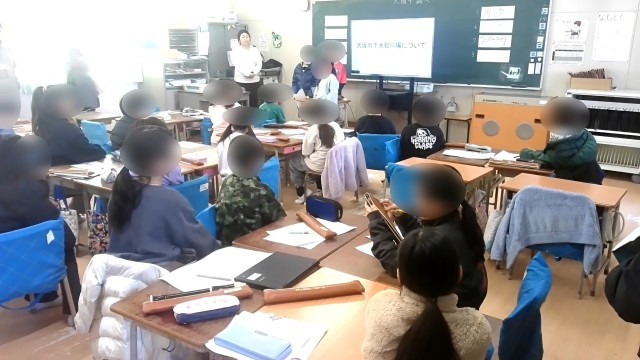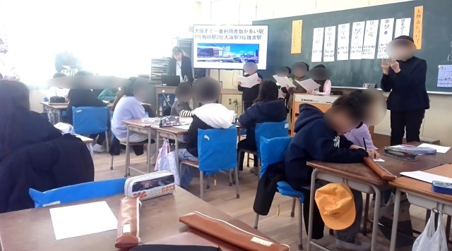 3年生は3学級とも社会科の調べ学習の発表で、大阪市の施設がテーマでした。班によって、市内の鉄道の駅についてだったり、公園についてだったり、学校についてだったりしていました。