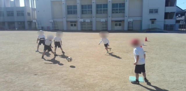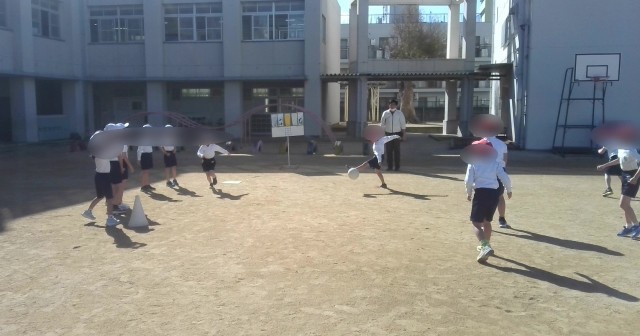 体育の学習です。キックベースボール型のゲームをしていました。まずは2人一組でボールをける練習をしっかりしてからゲームに臨みました。