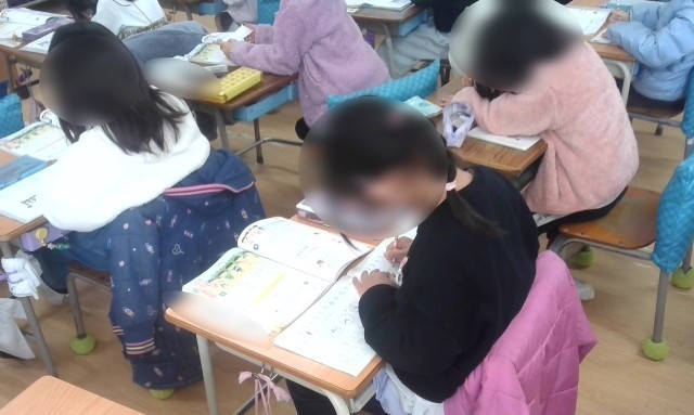 算数の学習です。「4人の子どもがいすにすわっています。いすはあと6きゃくあります。いすはぜんぶでなんきゃくありますか。」という問題を考えていました。椅子の絵と子どもの絵を黒板に貼りるとともに、同じ図が描かれているワークシートを配って、黒板とワークシートを見比べながら考えていました。足し算を図で示して視覚的にとらえて考えようとしていました。