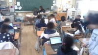 算数の学習です。「青いかみが7まいあります。赤いかみは青いかみより4まいおおいです。赤いかみはなんまいですか。」という問題に取り組んでいました。まずは「青いかみと赤い紙とではどちらが多いでしょう」という質問から「赤いかみのほうが多い」という意見を導き出し、答えは7より大きくなると見通しをもたせて考えさせていました。次に黒板に青いかみと赤いかみの数を比べられるように丸印を描いて視覚的に考えが整理できるようにして答えを導き出せるよう工夫していました。