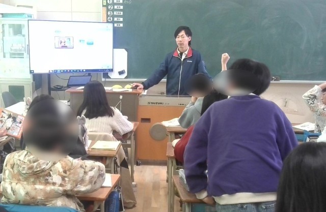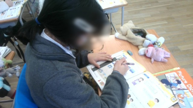 英語の学習です。モニタの動画を観ながら教科書の問題に答えていく学習でした。映像の場面シチュエーションを頭に入れて英語をしっかりと聞き取って問題に取り組んでいました。
