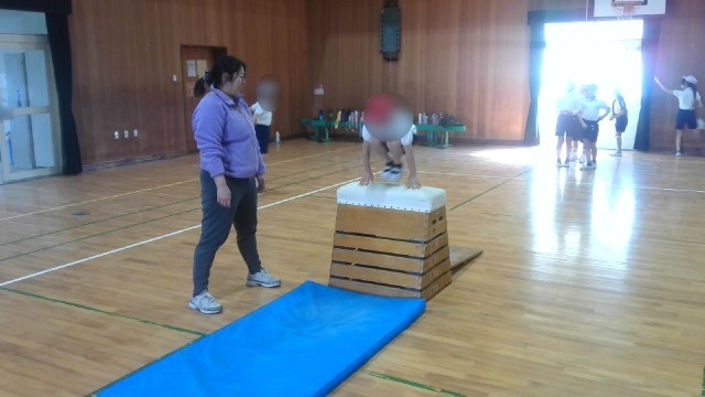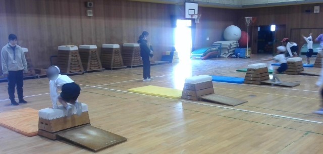合同体育で跳び箱運動をしていました。開脚跳びとかかえこみ跳びの練習で、跳び箱の高さを変えた場を作り、自分の課題にあった場で練習していました。