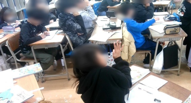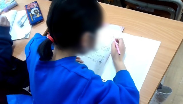 算数の学習です。直方体や立方体の学習で、面に位置関係について考えていました。プリントに図示された直方体の面㋐と面㋑はどう接しているかを考えるとき(直角の接しているが正解)、自分の腕を使って表現していました。