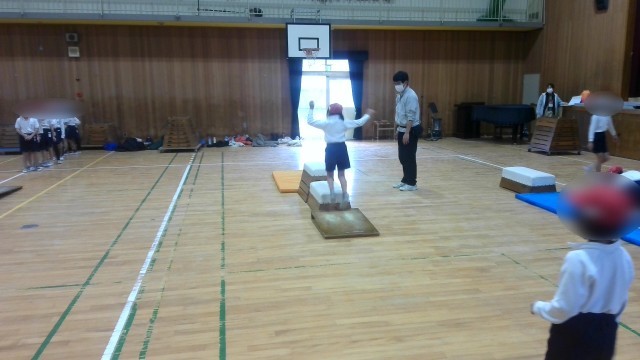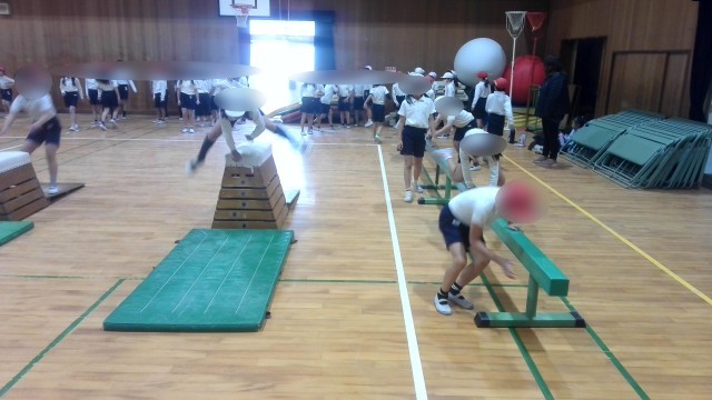 合同体育で、跳び箱遊び運動をしていました。各学級でやっていることを全体で確認していました。腕の支持がしっかりしてきたし踏切のタイミングもうまくなってきました。