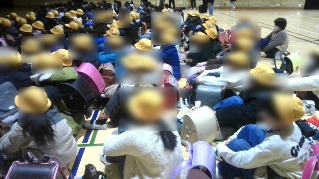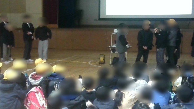 最初に体育館に集まって墨江丘中生徒会の皆さんから中学校についてや学校生活などに対しての説明を受けました。スライドを観ながら生徒会執行委員の方からわかりやすくお話をしていただきました。中学生になったら毎日持っていくリュック(教科書やその他学習道具が入っている)を担いで重さを体験するコーナーもありました。