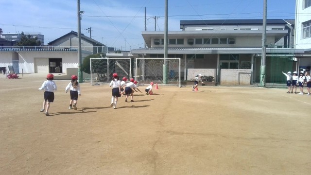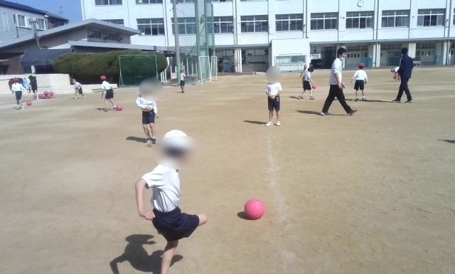体育で、キックベース型のゲームの学習です。ボールをうまくコントロールして狙った方向にけりだせるようにする練習をチームでした後、ゲームに取り組んでいました。