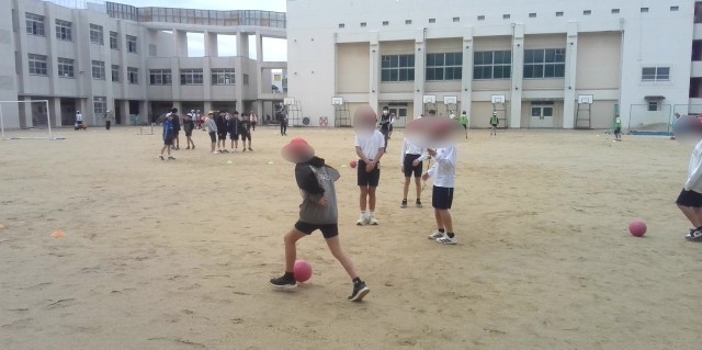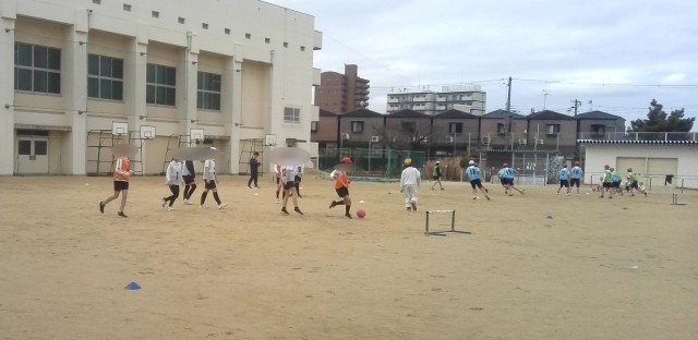 体育の学習でした。ゲームをしているグループと、ドリブルのテストを受けたり作戦のチーム練習をしていたりするグループに分かれて活動していました。