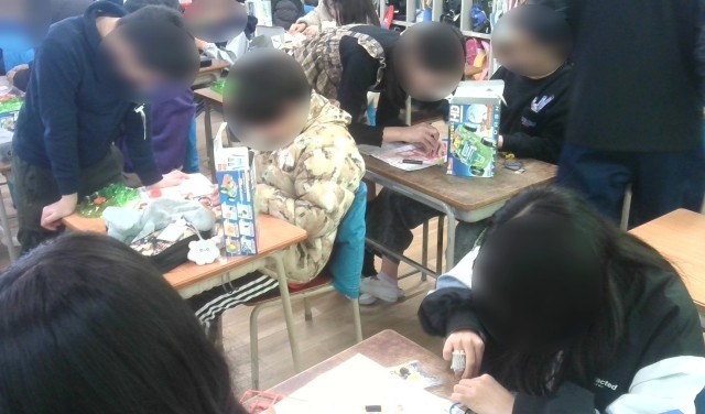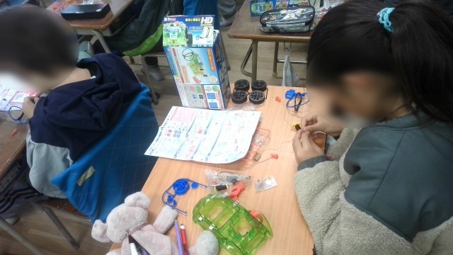 理科の学習です。電流と電磁石の学習の実験に使うキットを作っていました。電磁石を作るためのコイルを巻いたり、配線をつなげたり、友だちとも協力しながら丁寧に作っていました。