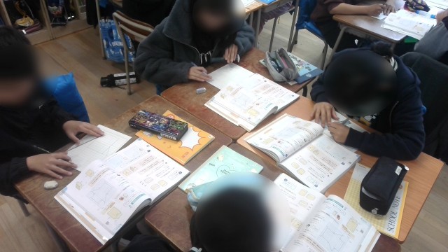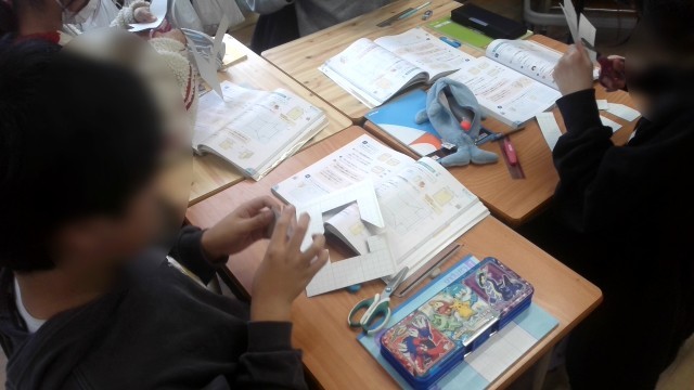 算数の学習です。図形の単元で、三角柱について考えていました。教科書の図を基に展開図を描いて実際に三角柱を組み立てていました。組み立てた三角柱を使って学習を進めていきます。