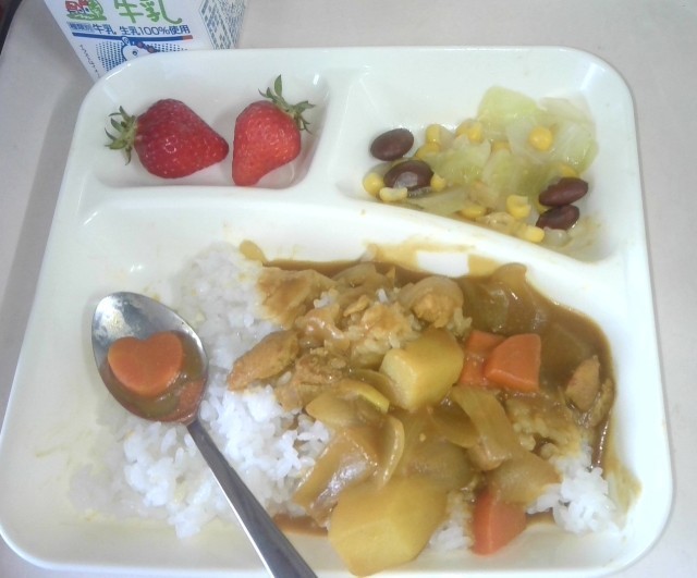 今日の献立は、チキンカレーライス、金時豆と野菜のサラダ、イチゴ、牛乳です。いただきます。