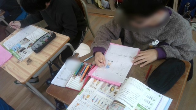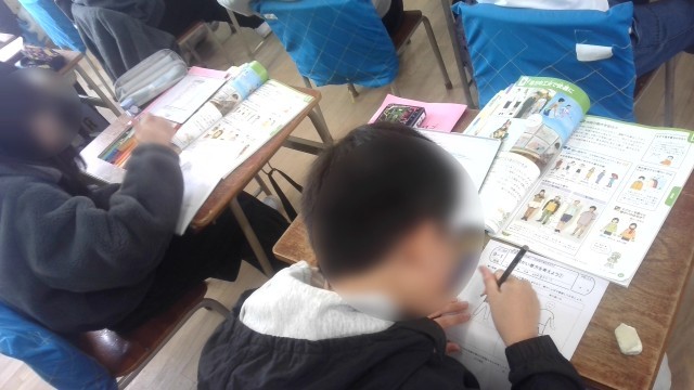 家庭科の学習で、季節に合った服装について考えていました。寒い時期の服装の様子や暑い時期の服装の様子などを思い出してワークシートに描いていました。この後、みんなで意見交流して季節に合った着方について深めていくようです。