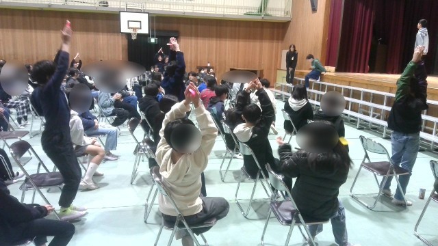 先生チームと児童チームでゲームした「叩いてかぶってじゃんけんポン」はとても盛り上がっていました。