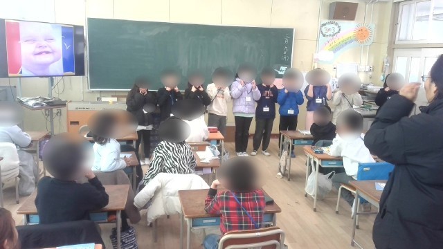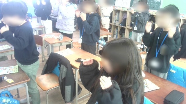 英語活動の時間でした。C-NETの先生とゼスチャーゲームをしながら英語を学んでいました。「あなたはいま?」の問いかけに「幸せ・happy」「悲しい・sad」「怒っている・angry」「おなかがすいている・hungry」などの単語をゼスチャーしながら答えるゲームです。単語とゼスチャーが一致しなかったら脱落していくゲームで、残った人たちは前でゲームを続けて最終勝者を決めていました。