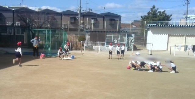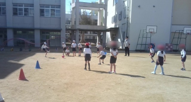 体育の学習で、ボール遊び運動をしていました。キックでボールを転がしていく練習をした後、キックベース型ゲームあそびを楽しんでいました。