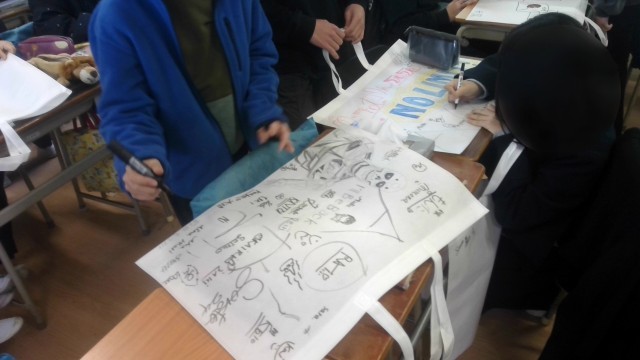 6年生も図工の時間を使って作品袋の製作をしていました。自分でデザインを考えて描いている子が多かったです。また、たくさんの友だちにサインしてもらって、寄せ書き風にしている子もいました。