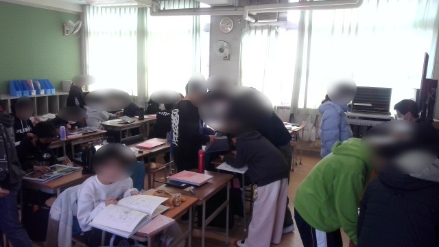 上段から、1組、2組、3組の様子です。先生の話を聞いたり、卒業アルバムに互いに寄せ書きをしたり、今日の清掃活動の場所決めをしたりしていました。
