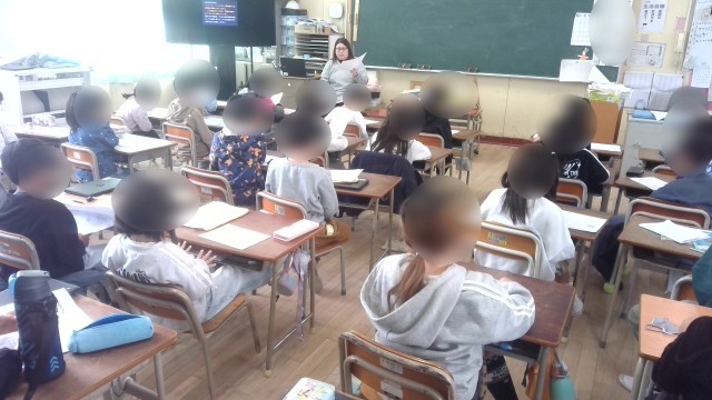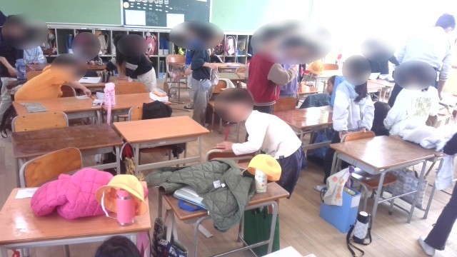 上段は1組、テストの答え合わせやプリントの返しなどをしていました。中段は2組、各自の机の中やロッカーなどの整理をしていました。下段は3組、春休みの暮らしについての話を聞いていました。