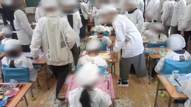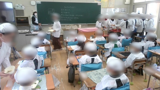 1年生は初給食で下。6年生のお兄さんお姉さんが配膳や片づけを手伝ってくれました。配膳してくれている間、行儀よく静かに待っていました。「はい、どうぞ」と自分のところに配ってもらったら「ありがとう」と感謝を示していました。