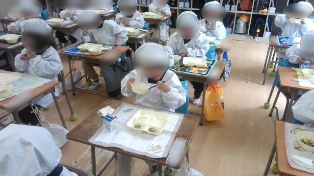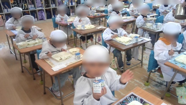 全員に配膳た後、先生から牛乳の飲み方の説明を受けて「いただきます」をしました。あちこちから「おいしい」という声が聞こえていました。しっかりと食べて元気に育ってほしいです。