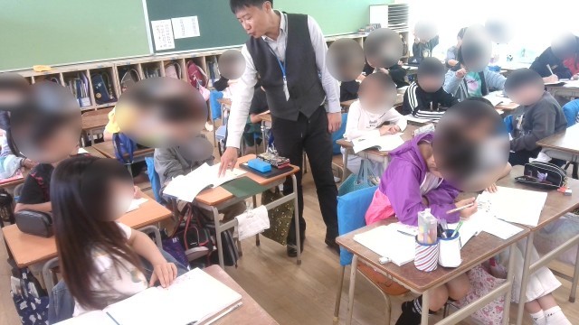国語の学習です。物語文を読み、その段落の中で主人公の心情を表す言葉を探していました。自分でこれだろうという目星をつけたら近くの友だちと交流して、自分の意見を確かめたり友だちの意見を参考にして再度探したりして、学習を深めていました。