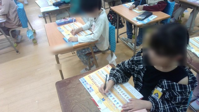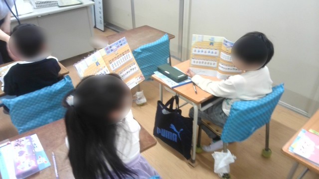 算数の学習です。机の前に座っているウサギと机上にある三角帽子を線で結び、帽子の数が足りているかを確かめていました。二つの数を数えて対応しているかどうかを考える学習です。ウサギが6羽で帽子が7つ「帽子が1個多い」ことを見つけていました。