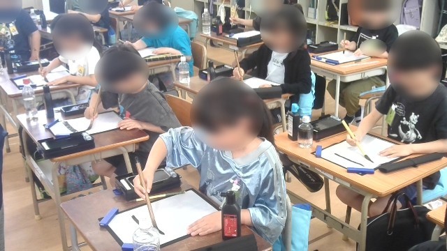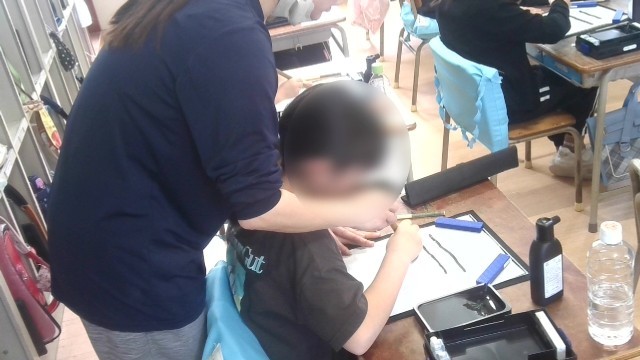 書写の学習です。初めての毛筆の学習で、書道セットの使い方や毛筆の持ち方などについて指導を受けた後、実際に書いてみました。いい姿勢で丁寧に書いていました。